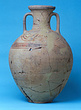 | Description: | Mended from many pieces and restored in plaster. Simple foot with flat underside; slightly uneven ovoid body. Strap handles, profiled lip. Two lines below belly; shoulder is main area of decoration. Three bands at bottom. Above these on each side are two spirals. On handles, a cross, which continues down ending in a loop on either side of handle. Band on inside and outside of lip. Submycenaean. Brown glaze. Pale yellow clay. Cf. Styrenius (1967), Submycenaean Studies, fig. 50. ADDENDA V. Desborough has seen this vase and suggests a date in the 11th c. | |