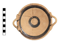 | Description: | Complete; mended from three pieces. Shallow plate with two horizontal ribbon handles, flat base. Inside decorated with two concentric bands of black glaze, one just inside rim; other at bottom of plate. Cf. Agora XII, pp. 198ff.; P 19052. | |