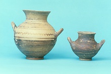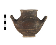 Description:   Intact. Plain foot with roughly concave underside. Globular body with greatest diameter halfway up. Narrows into neck with continuous curve, then widens to flaring rim. Horizontal handles spring from belly at 45° angle. Thin brown glaze on outside, except inside handles; glazed on inside of mouth, with glaze dripping down inside. Underside unglazed.