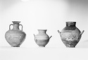 | Description: | Rim chipped, glaze badly flaked. Flat bottom, torus base. Ovoid body with greatest diameter above middle height. Short, almost vertical neck. Handles at belly, at ca. 45° angle. Glazed all over except handles and reserved band at belly. Glaze dripped inside mouth. Stripe of glaze on handles and on outside of handle attachments. Decorated panel; from top: row of dots, 4 bands, row of dots, concentric semicircles (not compass drawn) alternately hanging and resting on ground line; 3 bands. Submycenaean. Brown glaze. Yellow-gray clay. | |