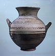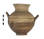 | Description: | Rim chipped, glaze and surface peeling. Ring foot with nipple underneath. Ovoid body with handles attached just above belly. Short neck with flaring mouth. Two reserved bands at neck. At belly, decoration in reserved band - wavy line between two straight lines. Handles glazed. Glaze around inside of mouth. Submycenaean. Brown glaze. Pale yellow clay. | |