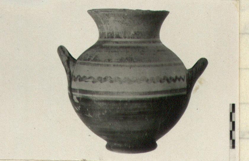 | Description: | Rim chipped, glaze and surface peeling. Ring foot with nipple underneath. Ovoid body with handles attached just above belly. Short neck with flaring mouth. Two reserved bands at neck. At belly, decoration in reserved band - wavy line between two straight lines. Handles glazed. Glaze around inside of mouth. Submycenaean. Brown glaze. Pale yellow clay. | |