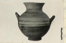Description:   Rim chipped, glaze and surface peeling. Ring foot with nipple underneath. Ovoid body with handles attached just above belly. Short neck with flaring mouth. Two reserved bands at neck. At belly, decoration in reserved band - wavy line between two straight lines. Handles glazed. Glaze around inside of mouth.