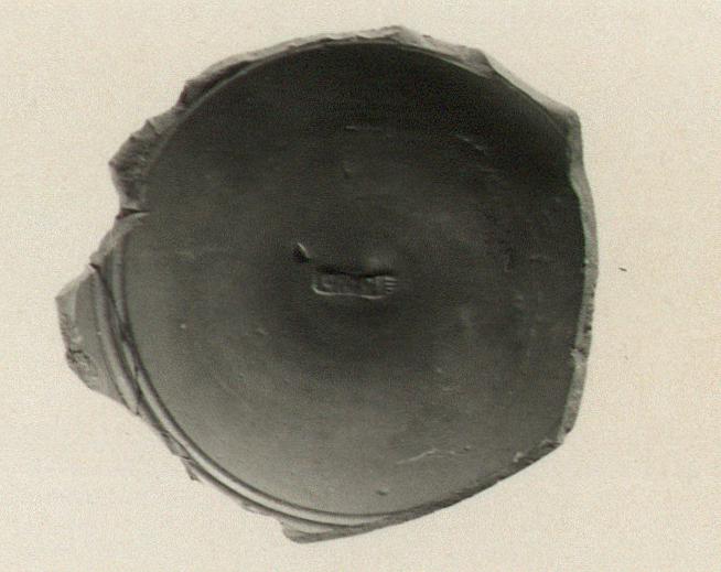 | Description: | Two non-joining fragments mended from a Western Sigillata bowl. a) Ring foot and start of flaring lower wall. Within, two incised circles surround impressed footprint: L R P I in planta pedis. b) Top of flaring lower wall, as well as vertical, slightly convex, upper wall. Upper wall set off from lower by slight flange and rouletted incised groove near rim. Hard slightly shiny red glaze. Brick red clay. | |