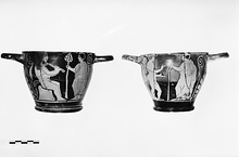 | Description: | Large chips missing. Mended and restored in plaster. Torus ring foot, out-turned rim, triangular handles. A) Nude youth at left approaching a standing draped male who holds a staff in his right hand. B) Two standing draped figures facing one another, one holding a staff. Each scene framed by high tendrils; a large palmette under each handle. Reserved: resting surface, underside with two glazed circles. Upper half badly misfired. Pink clay. Cf. Agora XII, no. 349. | |