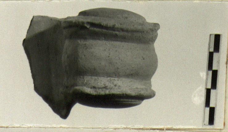 | Description: | Broken off from pot. Apparently the handle of a large basin. Handle is a hollow cylinder with something inside which rattles. Micaceous orange clay. | |