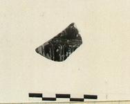 | Description: | Single fragment, broken all around. Fragment preserves top of long rounded petals which covered wall of bowl. Their surfaces are convex. Rim pattern is inverted, hanging stepped pyramids, over two edges. Black glaze; Attic clay. Cf. P 20204; possibly from same bowl or same mould. | |