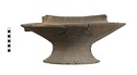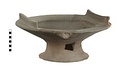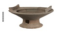 Description:   Mended and restored. Parts of body, rim, one spit-rest and handles missing. Concave, hollow foot with two roughly cut square openings opposite each other. Steeply sloping sides of bowl rise to broad flat rim which slopes very slightly inward. Spit-rest rises vertically from rim; only one preserved; top of spit-rest slightly concave. Base of heavy loop handle preserved in position between spit-rest and above square opening of base.