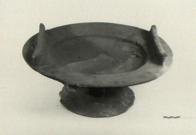 | Description: | Mended and restored. Parts of body, rim, one spit-rest and handles missing. Concave, hollow foot with two roughly cut square openings opposite each other. Steeply sloping sides of bowl rise to broad flat rim which slopes very slightly inward. Spit-rest rises vertically from rim; only one preserved; top of spit-rest slightly concave. Base of heavy loop handle preserved in position between spit-rest and above square opening of base. Coarse gray granular fabric. Aeginetan. Cf. Agora XII, no. 2030. | |