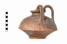 | Description: | Mended and restored. Small parts of body missing. Domed upper body meeting lower flaring wall at sharp angle. Low ring foot. Ring mouth, short concave neck. Two vertical handles placed close to each other on one side of pot, rising above rim. Deep vertical groove on handle. Completely glazed inside and out except for underside of base. Orange fabric. Glaze unevenly applied; black to dull orange in color. Cf. Agora XII, nos. 164-166. | |