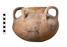 Description:   Mended and heavily restored. Major portion of body, part of rim and most of one handle restored. Rounded body with no defined base; high, slightly flaring rim with flange on inside; two rolled handles (one restored) set horizontally; pierced spout, no glaze.