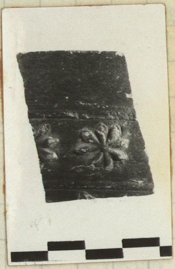| Description: | Rim fragment of moldmade bowl with inverted rim. Pattern is eight-petalled daisies between ridges. Trace of body decoration preserved. Dull black glaze. | |