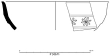 | Description: | Rim fragment of moldmade bowl with inverted rim. Pattern is eight-petalled daisies between ridges. Trace of body decoration preserved. Dull black glaze. | |