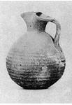 | Description: | Pear-shaped body; no foot, but a flat bottom. Small vertical handle. Trefoil mouth. Coarse red clay fired black on lower body. Traces of blackish paint (over a buff slip?) on handle and on body below handle. Local ware. | |