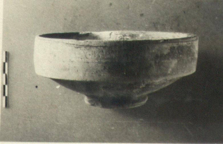 | Description: | Rim profile nearly straight, slightly incurving. Around rim just below lip a single grooved line. Buff clay; red matte paint inside and out, partly covering the ring foot. Late Roman. | |