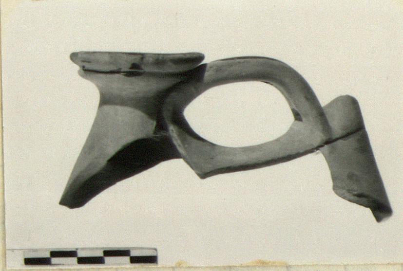 Description:   Upper part, handle, and mouth preserved of an unglazed duck askos.