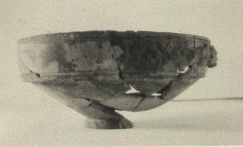 | Description: | Foot medium, with two incised rings inside. Two horizontal lug handles, double grooved. Coarse buff clay, red matte paint, much flaked inside and some way below rim outside. On rim, in white paint: A <graphic> B <graphic> Late Roman D. | |