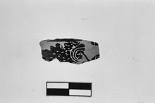 Description:   Worn black figure fragment. Lekythos? Head of Herakles.