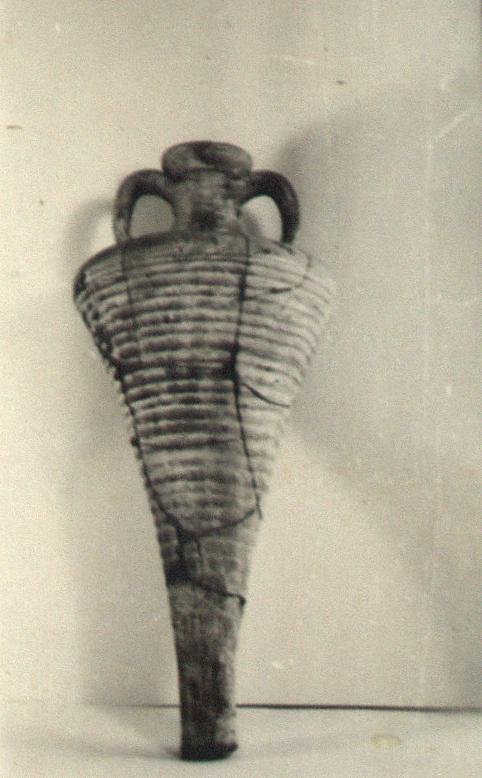 | Description: | Broad, nearly flat shoulder. The pinched in body tapers to a plain straight foot. Horizontal ribbing on body below shoulder. Outside heavily coated with white slip or paint. Coarse red clay with many impurities. Unglazed. | |