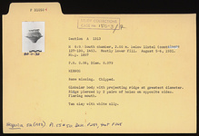 | Description: | Base missing. Chipped. Globular body with projecting ridge at greatest diameter. Ridge pierced by two pairs of holes on opposite sides. Flaring mouth. Tan clay with white slip. | |