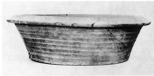 | Description: | The thick flaring rim is turned over and down. Horizontal ribbings on the body. Coarse pinkish clay, unglazed. ADDENDA: Mended an restored; over one-quarter of base and part of wall and rim missing. Flat smooth base, slightly pitted. ADDENDA Cf. P 1973. [JWH, added 6 Oct. 2015] | |