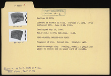 | Description: | Fragment of rolled rim. Straight wall. Reddish-orange clay. Peeling, metallic gray-black glaze on inside and on upper part of outside. | |