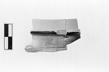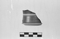 b) Fragment of rim, mended from two pieces. Plain rim with flange for lid on exterior. Low ridge at junction of lower body and vertical upper body. Reserved: upper surface of flange and area above to rim.
