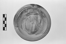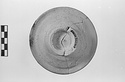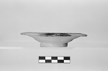 Description:   Mended from two pieces, preserves complete profile; part of rim missing. Small saucer with out-turned rim bearing two parallel grooves. Thin wash on inside.