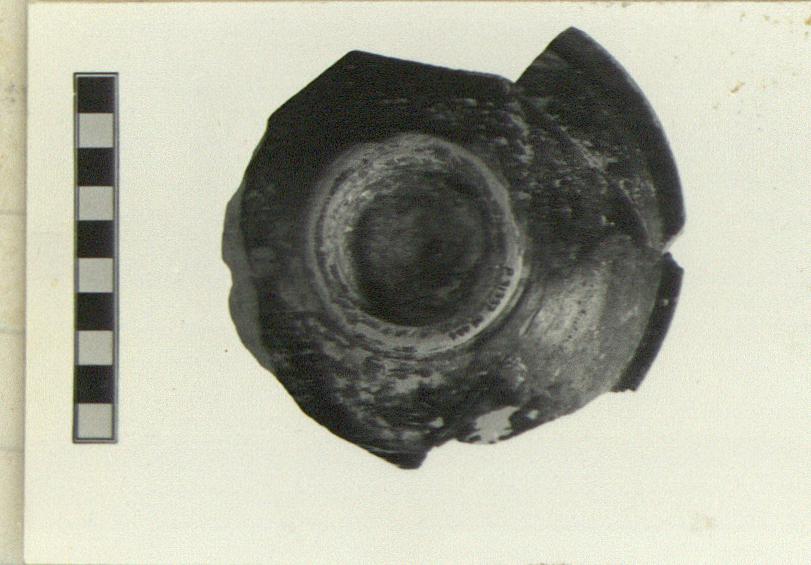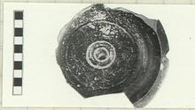 | Description: | Mended from three pieces, preserving complete profile. Much of rim broken away. Small black glaze plate with out-turned rim. In center of inside bottom, small depression with a raised ring inside. Groove around inside bottom. Ring foot. Thin dark wash. Vessel may also have been used as a lid. | |