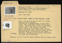 Description:   From a fairly thin-walled vase, but large; unglazed on the inside. Represented is a draped woman, facing half right. Her right arm is held out in front of her. Above the hand is the corner of an object with a ring (incense burner?). Relief contours; the drapery done in fine swirling relief lines. A black border on the himation which is fastened on the right shoulder. Necklace and bracelet from which all color has disappeared (possibly they were originally in applied clay).