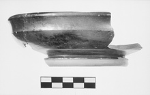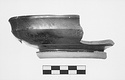 | Description: | Ca. one-fourth of vase from rim to foot. Handles and underside missing. Ring foot, lipped with bevelled resting surface. Shallow body, concave lip, inset on inside. Reserved: resting surface outside of foot, handle panels. Metallic black glaze. | |