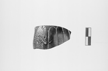 Description:   Wall fragment, broken all around. Upper wall of mug, probably of Phideas shape. Ribbed wall. In gap between ribs, stamped palmettes. Probably same palmette stamp as P 31451; probably from the same vase.