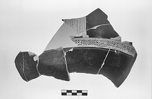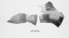 | Description: | Seven joining fragments from the lower body. On the left, the shanks of a woman wearing a peplos who stands frontally. On the right the feet of a figure to the left. Unglazed inside. | |