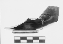 Description:   Base and one-fourth of wall, handles missing. Low ring foot with sharp resting surface from which glaze is worn away. Reserved, miltosed underside with two circles and dot. Reserved band at base of wall. Convex wall, nearly straight rim slightly inset. Handles attached below rim.