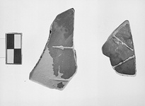 | Description: | Fragment from center of floor. Reserved underside with three circles. On floor, partial graffito: <graphic> Red to brown glaze. | |