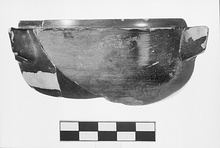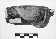 | Description: | Ca. half of upper wall preserved. Slightly concave upper wall curving into convex lower wall. Vertical flange for lid. Ribbon handles. Handle panels reserved and miltosed. Shiny black to dull green glaze. | |