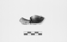 | Description: | Base and part of lower wall preserved. Flat base. Convex wall with broad reserved miltosed groove at base determining foot. Underside reserved and miltosed with central dot and circle. Shiny black glaze outside, duller and thinner inside. | |