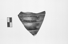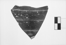 | Description: | Single wall fragment, broken all around. Wall horizontally ribbed. Shiny black glaze outside, unglazed inside. Cf. Agora XII, no. 200. | |