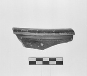 | Description: | Three non-joining sections. a) Preserves over half of rim, with handle. b) Floor. c) Rim fragment with handle scar. Ring foot, rounded, reserved resting surface. Projecting rim, rounded on top. Handle joined below rim. Handle panel reserved. Shiny black to brown glaze. | |
