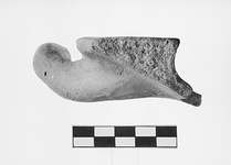 | Description: | Rim fragment, with part of handle. Shallow body, broad flat rim, overhanging on inside. Horizontal handle, round in section, attached below rim. Burning on inner edge of rim. Fine micaceous clay with fine inclusions (black and white) and voids. 2.5 YR 6/6. Cf. Agora XII, no. 2030. | |