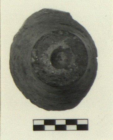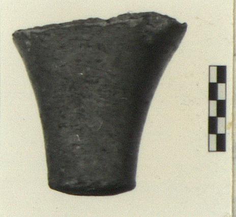 | Description: | Toe. Tapering toe, slightly convex underneath with small central depression. Fine gray clay with abundant mica, coarse white inclusions, large irregular voids. Lighter surface (10YR 5/1 gray). | |
