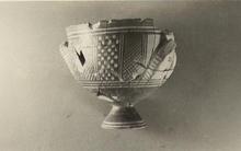 | Description: | Most of one handle, and considerable portions of the body missing. On either side, four vertical panels with, alternately, checkerboard pattern and lines crossing diagonally. Short black stripes on rising handles. Reserved beneath the handles. Three reserved bands beneath the patterns. Low conical foot with two reserved bands. Light buff clay; black glaze. | |