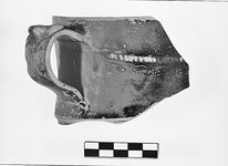 Description:   One handle and about one-half of one side of upper wall. Upper wall sightly concave, with scraped groove at bottom. Strap handle with ivy leaf thumb rest. West Slope decoration: ivy garland with thick stem, leaves alternate with dot rosettes. Only tan survives.