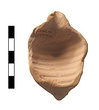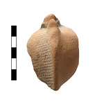 Description:   Part of neck, handle and body of plastic vase in shape of very large almond. Wheelmade with almond shape built up by hand. Almond pittings are in very regular rows, probably indicating use of some form of rouletting rather than an ordinary modelling tool.