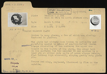 | Description: | Broken in many pieces, a few of which are missing. Restored in plaster. The plate had already been broken in antiquity and carefully mended by means of swallow-tailed leaden clamps consisting of two members; the upper was inlaid into the fabric of the plate, the other laid on the surface; the two secured to one another by a lead pin at either end; parts of seven clamps remain. Flat bottom; high side wall, sloping gently out; plain rim. Coarse red clay, unglazed, blackened by fire on the outside. Cf. P 10831. | |