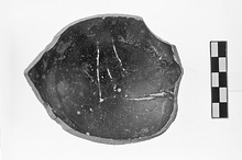 Description:   Base and part of lower wall preserved. Heavy base with broad, flat resting surface, thinly glazed. Convex underside rises to slight point. Finger marks on foot and lower wall.