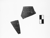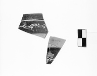 | Description: | Three fragments, one (a) of rim, two joining fragments (b) of wall. Very delicate, thin-walled, cup with plain rim. Outer wall grooved, starting 0.023 below rim. Scraped groove below rim inside. Below this, on fragment a), a very delicate ivy garland running right, with a reserved band below. Lower down, below another reserved band, an upside down bunch of grapes, with tendrils and leaf. Slightly metallic black glaze. Miltos. | |
