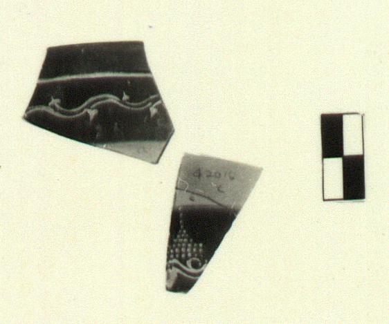 | Description: | Three fragments, one (a) of rim, two joining fragments (b) of wall. Very delicate, thin-walled, cup with plain rim. Outer wall grooved, starting 0.023 below rim. Scraped groove below rim inside. Below this, on fragment a), a very delicate ivy garland running right, with a reserved band below. Lower down, below another reserved band, an upside down bunch of grapes, with tendrils and leaf. Slightly metallic black glaze. Miltos. | |