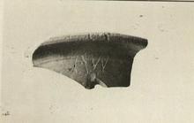 | Description: | Bowl fragment(?); the rim flat on top, projecting sharply on the outside, and slightly on the inside. On the top of the rim, two raised rings. Two letters scratched on the outside beneath the rim. The clay light red, covered inside and out with thin red glaze, considerably worn. | |