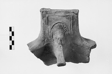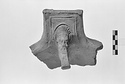 | Description: | Broken below. Brazier has projecting rim. Lug in the form of a head with a long, square beard and high hairdo. Cooking fabric with golden mica and large, translucent inclusions. Light red (2.5YR 5/6). | |